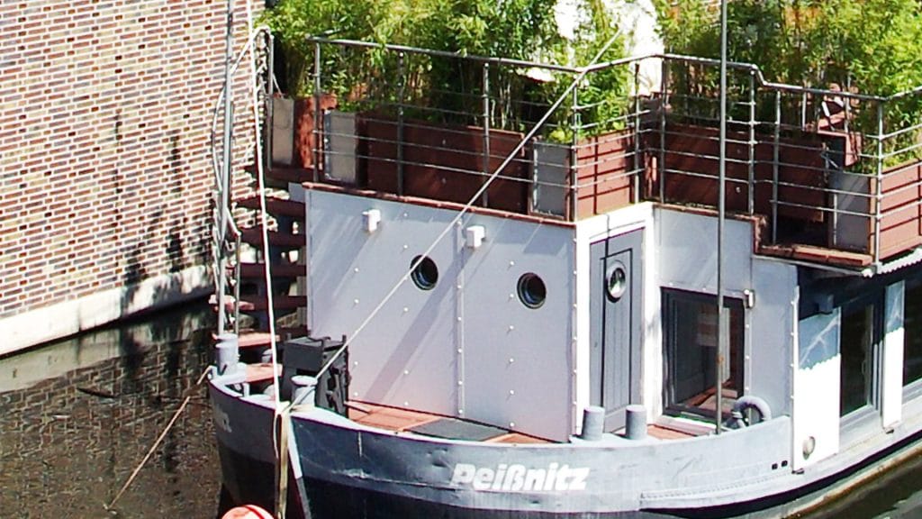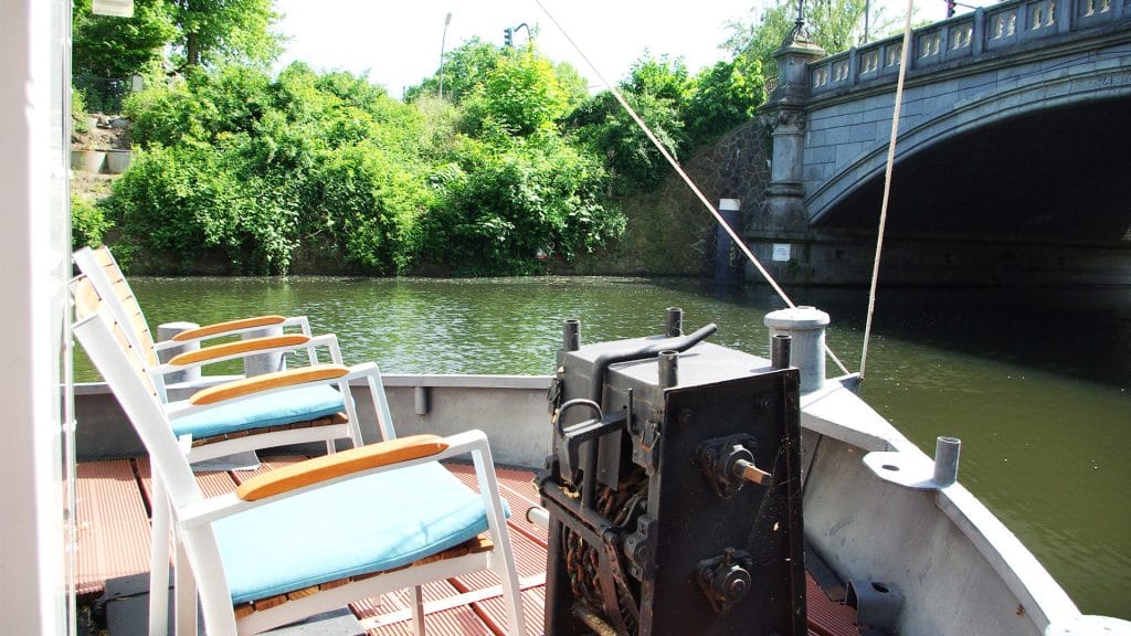 Die Bugterrasse der Ferienwohnung ist der über 160 Jahre alten unter Denkmalschutz stehenden Richardstrassenbrücke zugewandt und bietet von dem Hausboot einen mehrere Hundert Meter weiten Ausblick den Eilbekkanal entlang bis zur nächsten Brücke. Auf ihr ist am Bug die funktionsfähige, originale DDR Ankerwinde vom historischen Wohnschiff Peissnitz montiert. Nachmittags und bends lassen sich hier noch späte Sonnenstrahlen einfangen.
